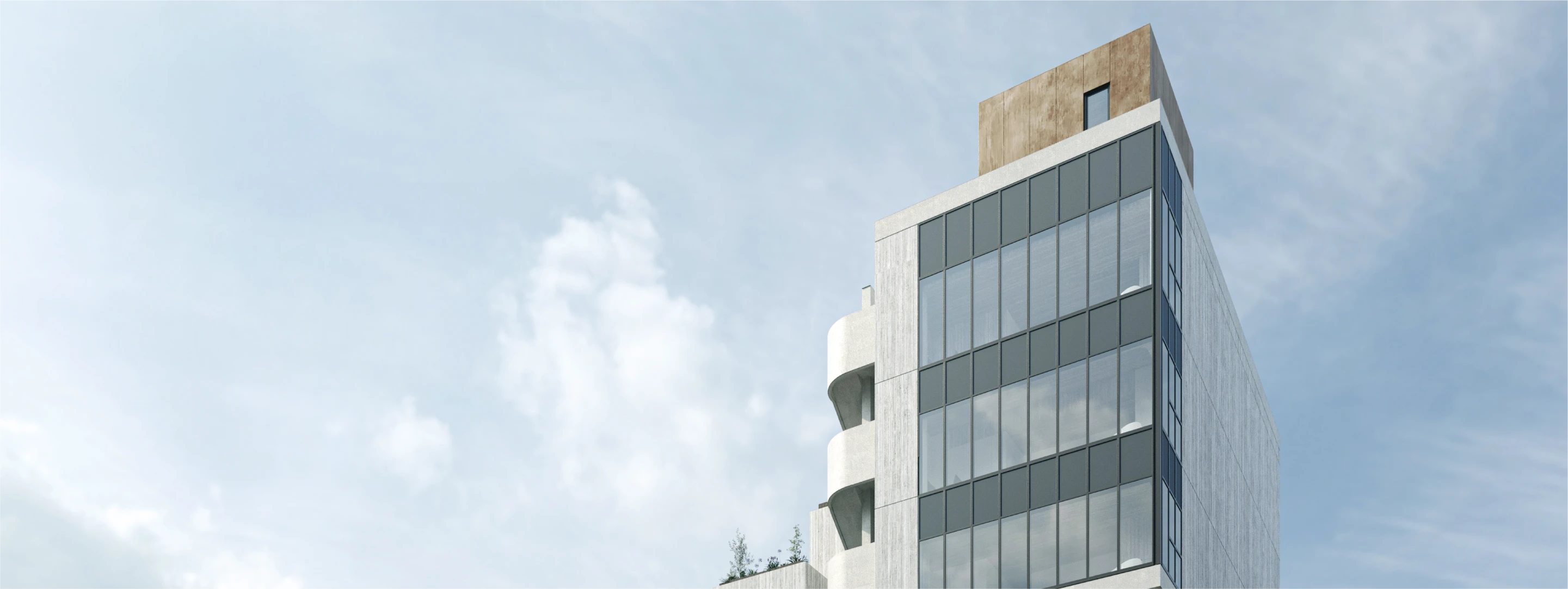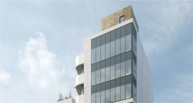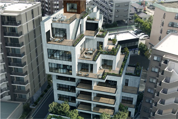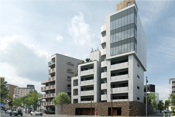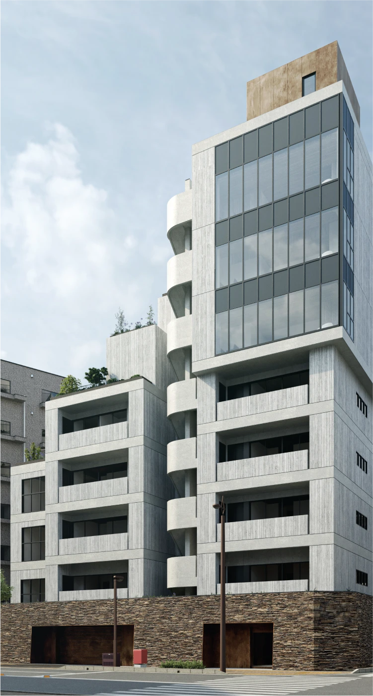 福岡城の城壁から着想を得た基壇に力強いコンクリートの躯体をのせ、個性豊かな各戸を積み重ねています。