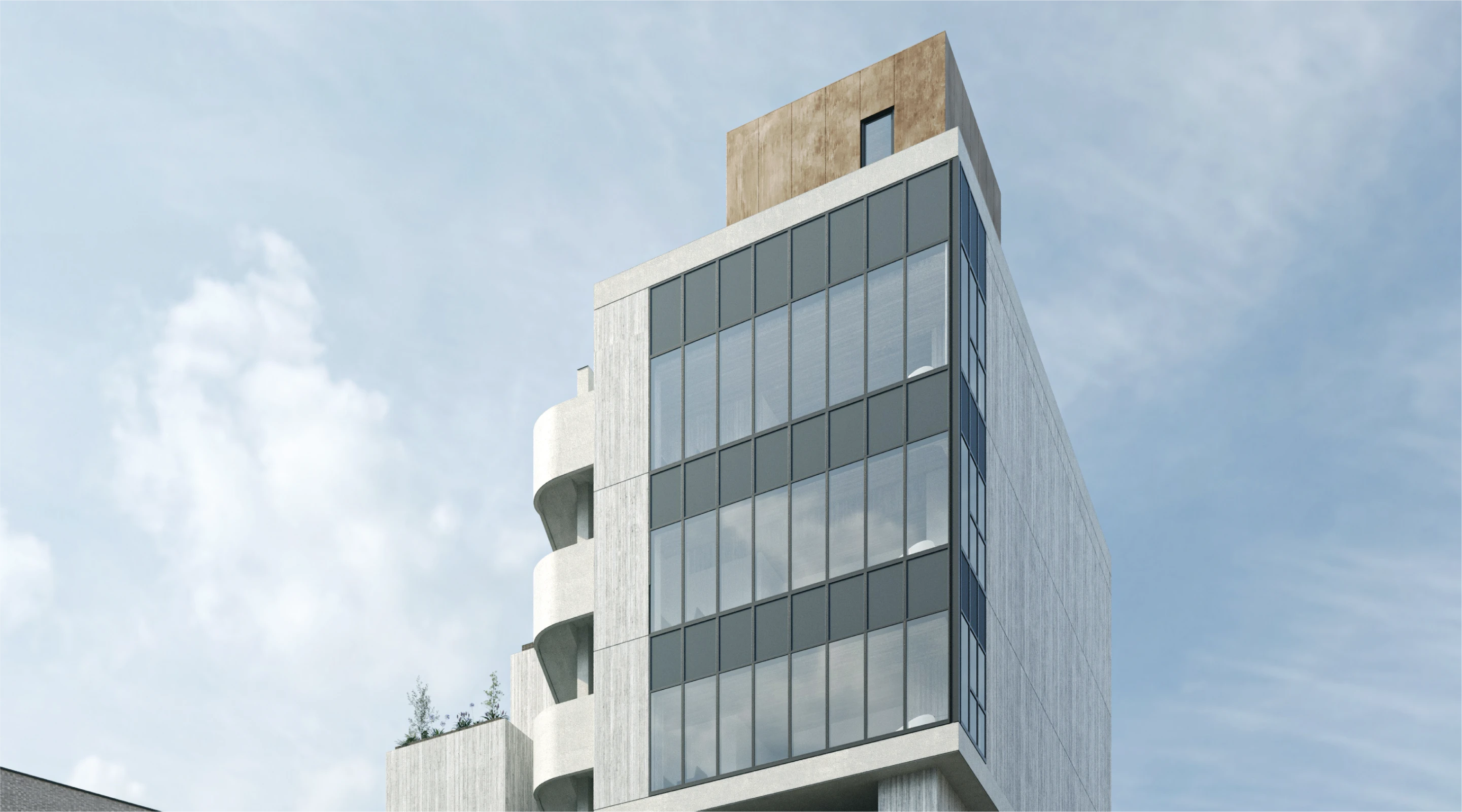 福岡城の城壁から着想を得た基壇に力強いコンクリートの躯体をのせ、